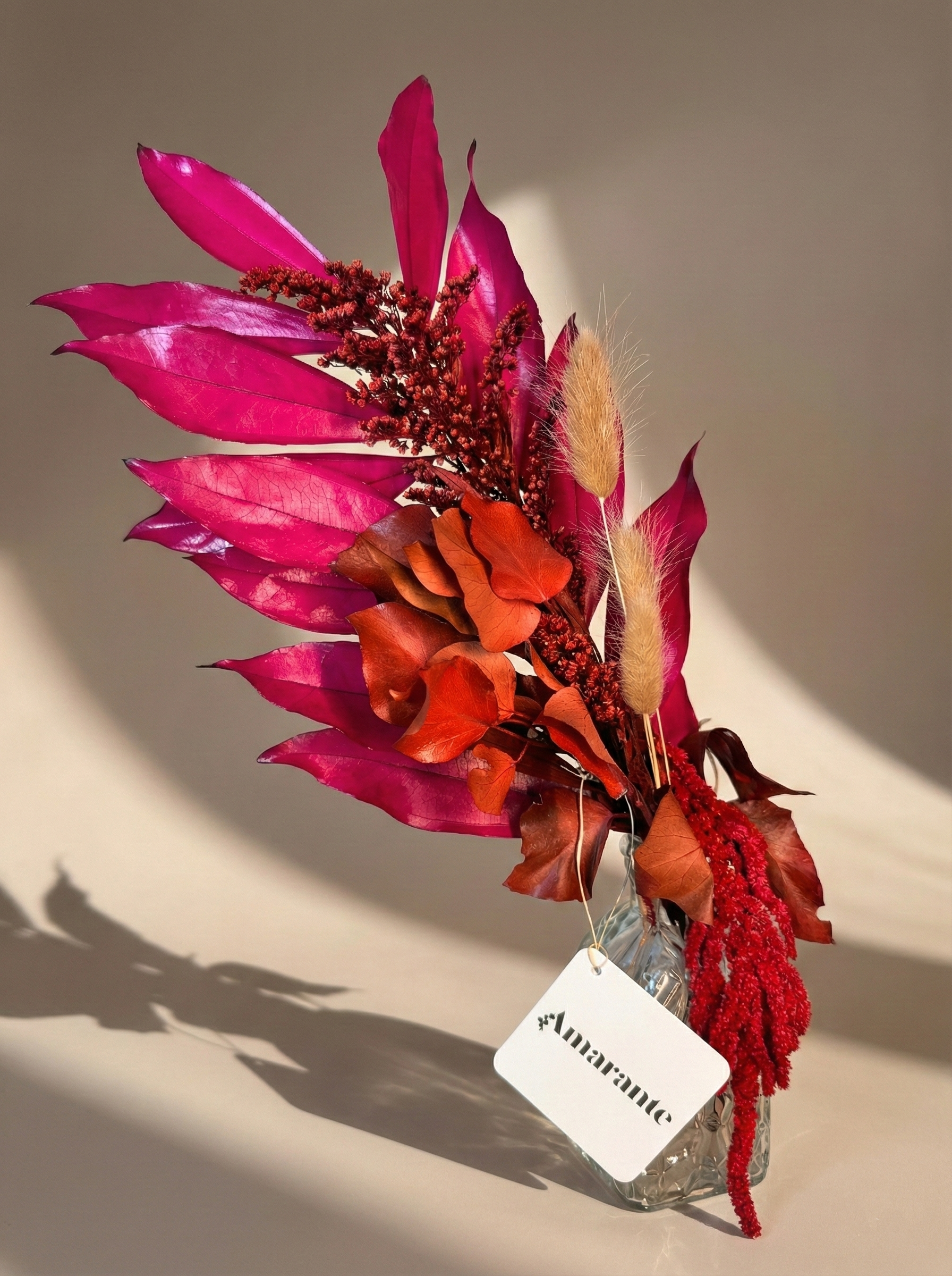 Chez Amarante, chaque création est réalisée à la main, dans une approche résolument artisanale. Nous travaillons les plantes stabilisées comme une matière à part entière, en composant avec les volumes, les textures et les nuances pour donner naissance à des pièces uniques. Mur végétal, patch mural, bouquet ou installation sur mesure : chaque réalisation est pensée en lien avec son lieu, son usage et son atmosphère. Loin des compositions standardisées, nous privilégions le geste, l’équilibre et le détail pour créer des œuvres végétales durables, sans entretien, qui traversent le temps avec justesse et élégance.